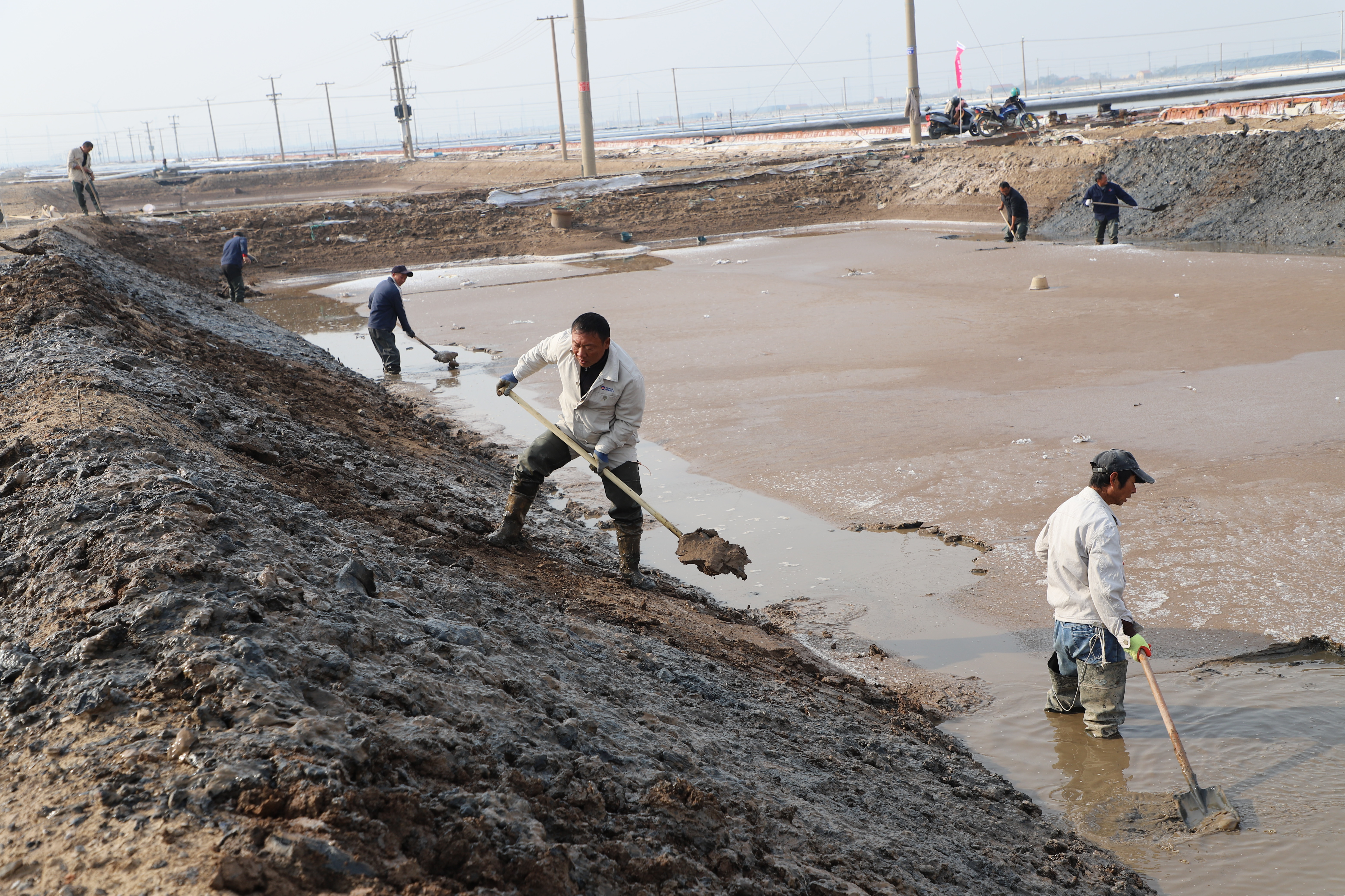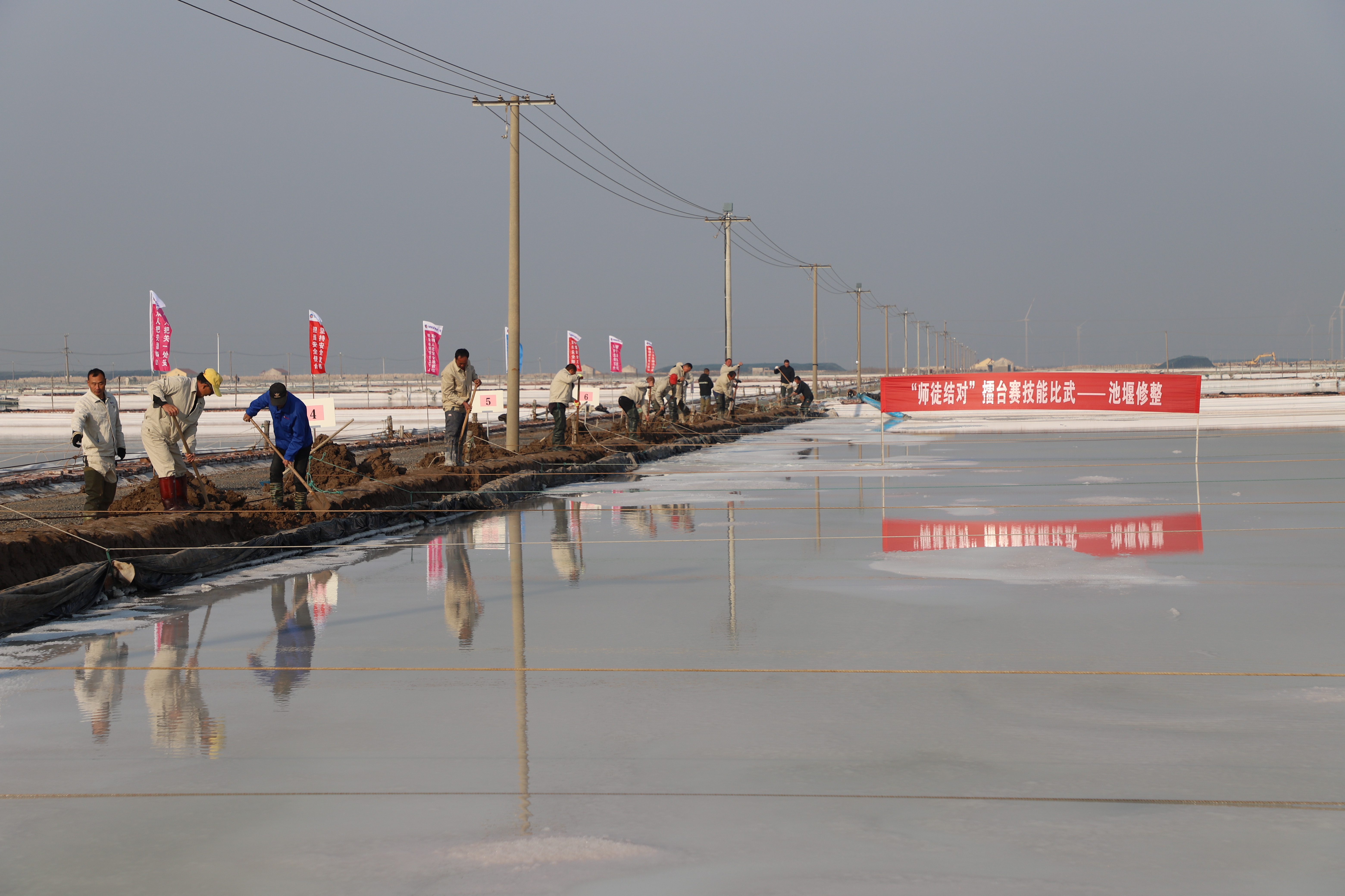 寒冬時(shí)節(jié),暖陽之下,鹽廩之旁,曬得黝黑的鹽場(chǎng)產(chǎn)業(yè)工人們按照競(jìng)賽的考核標(biāo)準(zhǔn),做熟泥、打堰墻、做堰頂,護(hù)埝頂、夯埝坡、清塘底,見證了一場(chǎng)技能比拼的盛會(huì)。經(jīng)過一天的鏖戰(zhàn),盧正兵、靳新邦、匡洪忠?guī)熗饺〉昧顺匮咝拚那叭涣謽滠姟⑴顺绍姟⒑^華師徒取得了土塘清淤的前三名。(西工)